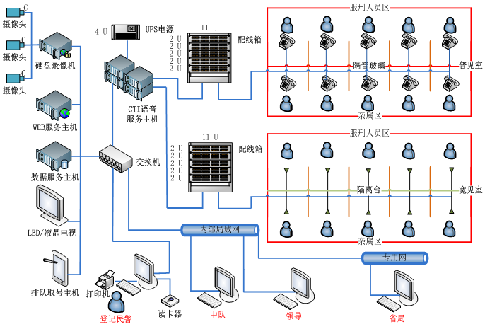 我公司依靠成熟完善的产品,进行了该项目的多次建设,部署后的会见系统,完全适应了需求,运行效果良好。对会见流程进行全程管理,包括:家属刷卡验证身份、会见全程录音、干警监控等。提供电脑、电话监控等多种方式。